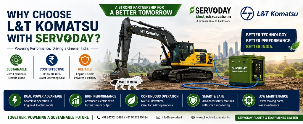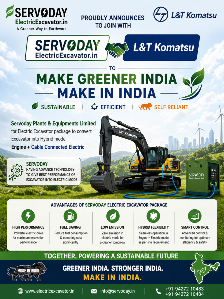 Servoday Plants & Equipments Limited proudly announces its collaboration with L&T Komatsu to accelerate India’s transition toward electric excavators, hybrid excavators, and sustainable earthmoving solutions.